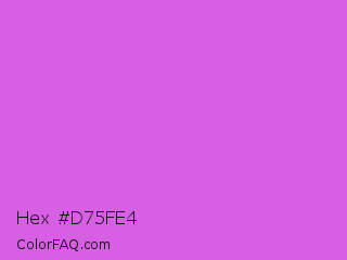 Hex #d75fe4 Color is a light magenta color and the nearest color is Orchid #da70d6. Hex code #d75fe4 and RGB value is rgb(215,95,228). In RGB color space, this color is composed of 84% red, 37% green, 89% blue, In CMYK color space, this color is composed of 6% cyan, 58% magenta, 0% yellow , 11% black , In HSL color space, this color has a hue angle of 294° , 71% saturation and 63% lightness.