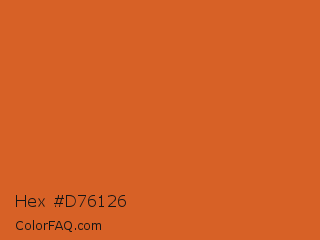 Hex #d76126 Color is a normal orange color and the nearest color is Vivid Red Tangelo #df6124. Hex code #d76126 and RGB value is rgb(215,97,38). In RGB color space, this color is composed of 84% red, 38% green, 15% blue, In CMYK color space, this color is composed of 0% cyan, 55% magenta, 82% yellow , 16% black , In HSL color space, this color has a hue angle of 20° , 70% saturation and 50% lightness.