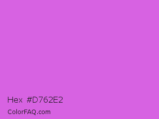 Hex #d762e2 Color is a light magenta color and the nearest color is Orchid #da70d6. Hex code #d762e2 and RGB value is rgb(215,98,226). In RGB color space, this color is composed of 84% red, 38% green, 89% blue, In CMYK color space, this color is composed of 5% cyan, 57% magenta, 0% yellow , 11% black , In HSL color space, this color has a hue angle of 295° , 69% saturation and 64% lightness.