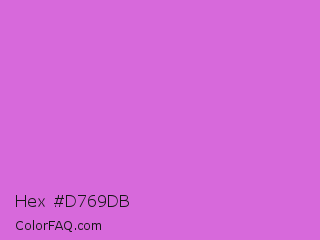 Hex #d769db Color is a light magenta color and the nearest color is Orchid #da70d6. Hex code #d769db and RGB value is rgb(215,105,219). In RGB color space, this color is composed of 84% red, 41% green, 86% blue, In CMYK color space, this color is composed of 2% cyan, 52% magenta, 0% yellow , 14% black , In HSL color space, this color has a hue angle of 298° , 61% saturation and 64% lightness.