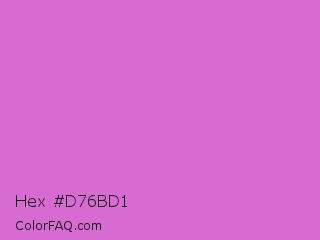 Hex #d76bd1 Color is a light magenta color and the nearest color is Orchid #da70d6. Hex code #d76bd1 and RGB value is rgb(215,107,209). In RGB color space, this color is composed of 84% red, 42% green, 82% blue, In CMYK color space, this color is composed of 0% cyan, 50% magenta, 3% yellow , 16% black , In HSL color space, this color has a hue angle of 303° , 57% saturation and 63% lightness.