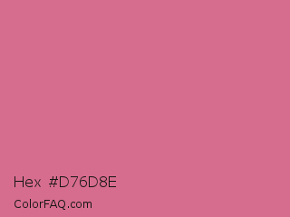 Hex #d76d8e Color is a light rose color and the nearest color is Pale Red Violet #db7093. Hex code #d76d8e and RGB value is rgb(215,109,142). In RGB color space, this color is composed of 84% red, 43% green, 56% blue, In CMYK color space, this color is composed of 0% cyan, 49% magenta, 34% yellow , 16% black , In HSL color space, this color has a hue angle of 341° , 57% saturation and 64% lightness.