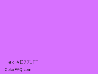 Hex #d771ff Color is a light purple color and the nearest color is Heliotrope #df73ff. Hex code #d771ff and RGB value is rgb(215,113,255). In RGB color space, this color is composed of 84% red, 44% green, 100% blue, In CMYK color space, this color is composed of 16% cyan, 56% magenta, 0% yellow , 0% black , In HSL color space, this color has a hue angle of 283° , 100% saturation and 72% lightness.