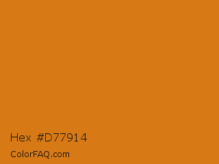Hex #d77914 Color is a normal orange color and the nearest color is Meteor #d07d12. Hex code #d77914 and RGB value is rgb(215,121,20). In RGB color space, this color is composed of 84% red, 47% green, 8% blue, In CMYK color space, this color is composed of 0% cyan, 44% magenta, 91% yellow , 16% black , In HSL color space, this color has a hue angle of 31° , 83% saturation and 46% lightness.