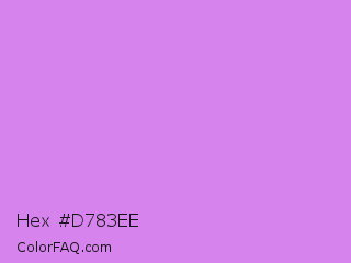 Hex #d783ee Color is a light purple color and the nearest color is Bright Lilac #d891ef. Hex code #d783ee and RGB value is rgb(215,131,238). In RGB color space, this color is composed of 84% red, 51% green, 93% blue, In CMYK color space, this color is composed of 10% cyan, 45% magenta, 0% yellow , 7% black , In HSL color space, this color has a hue angle of 287° , 76% saturation and 72% lightness.