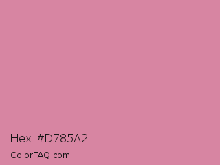 Hex #d785a2 Color is a light rose color and the nearest color is Can Can #d591a4. Hex code #d785a2 and RGB value is rgb(215,133,162). In RGB color space, this color is composed of 84% red, 52% green, 64% blue, In CMYK color space, this color is composed of 0% cyan, 38% magenta, 25% yellow , 16% black , In HSL color space, this color has a hue angle of 339° , 51% saturation and 68% lightness.