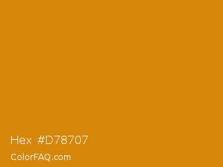Hex #d78707 Color is a normal orange color and the nearest color is Harvest Gold #da9100. Hex code #d78707 and RGB value is rgb(215,135,7). In RGB color space, this color is composed of 84% red, 53% green, 3% blue, In CMYK color space, this color is composed of 0% cyan, 37% magenta, 97% yellow , 16% black , In HSL color space, this color has a hue angle of 37° , 94% saturation and 44% lightness.