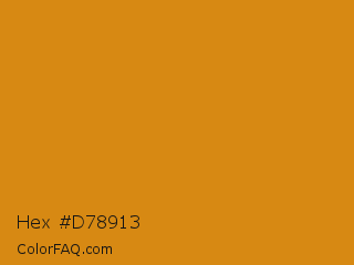 Hex #d78913 Color is a normal orange color and the nearest color is Golden Bell #e28913. Hex code #d78913 and RGB value is rgb(215,137,19). In RGB color space, this color is composed of 84% red, 54% green, 7% blue, In CMYK color space, this color is composed of 0% cyan, 36% magenta, 91% yellow , 16% black , In HSL color space, this color has a hue angle of 36° , 84% saturation and 46% lightness.