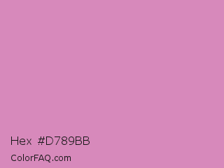 Hex #d789bb Color is a light magenta color and the nearest color is Middle Purple #d982b5. Hex code #d789bb and RGB value is rgb(215,137,187). In RGB color space, this color is composed of 84% red, 54% green, 73% blue, In CMYK color space, this color is composed of 0% cyan, 36% magenta, 13% yellow , 16% black , In HSL color space, this color has a hue angle of 322° , 49% saturation and 69% lightness.