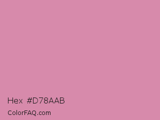 Hex #d78aab Color is a light rose color and the nearest color is Can Can #d591a4. Hex code #d78aab and RGB value is rgb(215,138,171). In RGB color space, this color is composed of 84% red, 54% green, 67% blue, In CMYK color space, this color is composed of 0% cyan, 36% magenta, 20% yellow , 16% black , In HSL color space, this color has a hue angle of 334° , 49% saturation and 69% lightness.