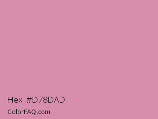 Hex #d78dad Color is a light rose color and the nearest color is Can Can #d591a4. Hex code #d78dad and RGB value is rgb(215,141,173). In RGB color space, this color is composed of 84% red, 55% green, 68% blue, In CMYK color space, this color is composed of 0% cyan, 34% magenta, 20% yellow , 16% black , In HSL color space, this color has a hue angle of 334° , 48% saturation and 70% lightness.