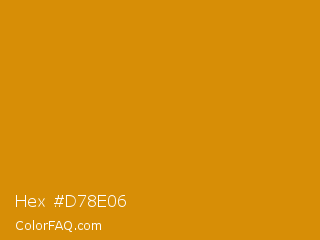 Hex #d78e06 Color is a normal orange color and the nearest color is Harvest Gold #da9100. Hex code #d78e06 and RGB value is rgb(215,142,6). In RGB color space, this color is composed of 84% red, 56% green, 2% blue, In CMYK color space, this color is composed of 0% cyan, 34% magenta, 97% yellow , 16% black , In HSL color space, this color has a hue angle of 39° , 95% saturation and 43% lightness.