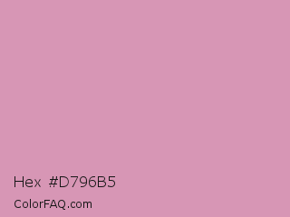 Hex #d796b5 Color is a light rose color and the nearest color is Careys Pink #d29eaa. Hex code #d796b5 and RGB value is rgb(215,150,181). In RGB color space, this color is composed of 84% red, 59% green, 71% blue, In CMYK color space, this color is composed of 0% cyan, 30% magenta, 16% yellow , 16% black , In HSL color space, this color has a hue angle of 331° , 45% saturation and 72% lightness.