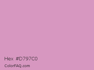 Hex #d797c0 Color is a light magenta color and the nearest color is Shocking #e292c0. Hex code #d797c0 and RGB value is rgb(215,151,192). In RGB color space, this color is composed of 84% red, 59% green, 75% blue, In CMYK color space, this color is composed of 0% cyan, 30% magenta, 11% yellow , 16% black , In HSL color space, this color has a hue angle of 322° , 44% saturation and 72% lightness.