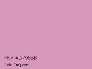 Hex #d798bb Color is a light magenta color and the nearest color is Shocking #e292c0. Hex code #d798bb and RGB value is rgb(215,152,187). In RGB color space, this color is composed of 84% red, 60% green, 73% blue, In CMYK color space, this color is composed of 0% cyan, 29% magenta, 13% yellow , 16% black , In HSL color space, this color has a hue angle of 327° , 44% saturation and 72% lightness.