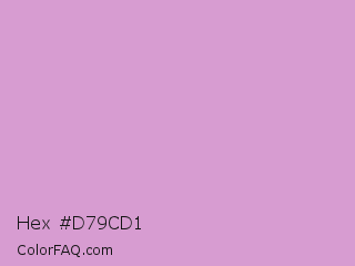 Hex #d79cd1 Color is a light magenta color and the nearest color is Light Medium Orchid #d39bcb. Hex code #d79cd1 and RGB value is rgb(215,156,209). In RGB color space, this color is composed of 84% red, 61% green, 82% blue, In CMYK color space, this color is composed of 0% cyan, 27% magenta, 3% yellow , 16% black , In HSL color space, this color has a hue angle of 306° , 42% saturation and 73% lightness.