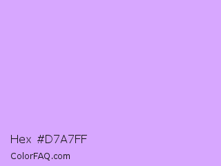 Hex #d7a7ff Color is a very light purple color and the nearest color is Mauve #e0b0ff. Hex code #d7a7ff and RGB value is rgb(215,167,255). In RGB color space, this color is composed of 84% red, 65% green, 100% blue, In CMYK color space, this color is composed of 16% cyan, 35% magenta, 0% yellow , 0% black , In HSL color space, this color has a hue angle of 273° , 100% saturation and 83% lightness.