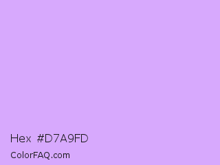 Hex #d7a9fd Color is a very light purple color and the nearest color is Mauve #e0b0ff. Hex code #d7a9fd and RGB value is rgb(215,169,253). In RGB color space, this color is composed of 84% red, 66% green, 99% blue, In CMYK color space, this color is composed of 15% cyan, 33% magenta, 0% yellow , 1% black , In HSL color space, this color has a hue angle of 273° , 95% saturation and 83% lightness.
