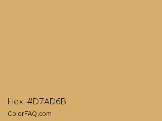 Hex #d7ad6b Color is a light orange color and the nearest color is Fawn #e5aa70. Hex code #d7ad6b and RGB value is rgb(215,173,107). In RGB color space, this color is composed of 84% red, 68% green, 42% blue, In CMYK color space, this color is composed of 0% cyan, 20% magenta, 50% yellow , 16% black , In HSL color space, this color has a hue angle of 37° , 57% saturation and 63% lightness.