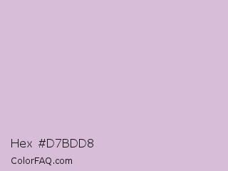 Hex #d7bdd8 Color is a light magenta color and the nearest color is Thistle #d8bfd8. Hex code #d7bdd8 and RGB value is rgb(215,189,216). In RGB color space, this color is composed of 84% red, 74% green, 85% blue, In CMYK color space, this color is composed of 0% cyan, 13% magenta, 0% yellow , 15% black , In HSL color space, this color has a hue angle of 298° , 26% saturation and 79% lightness.