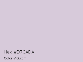 Hex #d7cada Color is a very light purple color and the nearest color is Languid Lavender #d6cadd. Hex code #d7cada and RGB value is rgb(215,202,218). In RGB color space, this color is composed of 84% red, 79% green, 85% blue, In CMYK color space, this color is composed of 1% cyan, 7% magenta, 0% yellow , 15% black , In HSL color space, this color has a hue angle of 289° , 18% saturation and 82% lightness.