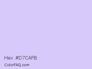Hex #d7cafb Color is a very light indigo color and the nearest color is Moon Raker #d6cef6. Hex code #d7cafb and RGB value is rgb(215,202,251). In RGB color space, this color is composed of 84% red, 79% green, 98% blue, In CMYK color space, this color is composed of 14% cyan, 20% magenta, 0% yellow , 2% black , In HSL color space, this color has a hue angle of 256° , 86% saturation and 89% lightness.