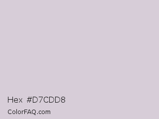 Hex #d7cdd8 Color is a very light magenta color and the nearest color is Languid Lavender #d6cadd. Hex code #d7cdd8 and RGB value is rgb(215,205,216). In RGB color space, this color is composed of 84% red, 80% green, 85% blue, In CMYK color space, this color is composed of 0% cyan, 5% magenta, 0% yellow , 15% black , In HSL color space, this color has a hue angle of 295° , 12% saturation and 83% lightness.