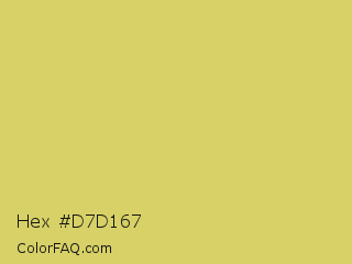Hex #d7d167 Color is a light yellow color and the nearest color is Chenin #dfcd6f. Hex code #d7d167 and RGB value is rgb(215,209,103). In RGB color space, this color is composed of 84% red, 82% green, 40% blue, In CMYK color space, this color is composed of 0% cyan, 3% magenta, 52% yellow , 16% black , In HSL color space, this color has a hue angle of 57° , 58% saturation and 62% lightness.