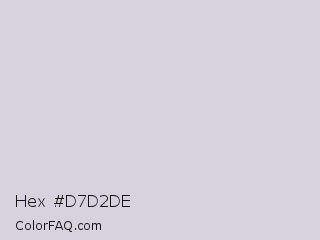 Hex #d7d2de Color is a very light violet color and the nearest color is Mischka #d1d2dd. Hex code #d7d2de and RGB value is rgb(215,210,222). In RGB color space, this color is composed of 84% red, 82% green, 87% blue, In CMYK color space, this color is composed of 3% cyan, 5% magenta, 0% yellow , 13% black , In HSL color space, this color has a hue angle of 265° , 15% saturation and 85% lightness.
