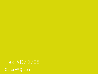 Hex #d7d708 Color is a normal yellow color and the nearest color is Citrine #e4d00a. Hex code #d7d708 and RGB value is rgb(215,215,8). In RGB color space, this color is composed of 84% red, 84% green, 3% blue, In CMYK color space, this color is composed of 0% cyan, 0% magenta, 96% yellow , 16% black , In HSL color space, this color has a hue angle of 60° , 93% saturation and 44% lightness.