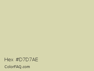 Hex #d7d7ae Color is a light yellow color and the nearest color is Sapling #ded4a4. Hex code #d7d7ae and RGB value is rgb(215,215,174). In RGB color space, this color is composed of 84% red, 84% green, 68% blue, In CMYK color space, this color is composed of 0% cyan, 0% magenta, 19% yellow , 16% black , In HSL color space, this color has a hue angle of 60° , 34% saturation and 76% lightness.