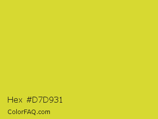 Hex #d7d931 Color is a normal yellow color and the nearest color is Pear #d1e231. Hex code #d7d931 and RGB value is rgb(215,217,49). In RGB color space, this color is composed of 84% red, 85% green, 19% blue, In CMYK color space, this color is composed of 1% cyan, 0% magenta, 77% yellow , 15% black , In HSL color space, this color has a hue angle of 61° , 69% saturation and 52% lightness.