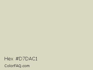 Hex #d7dac1 Color is a very light yellow color and the nearest color is Tana #d9dcc1. Hex code #d7dac1 and RGB value is rgb(215,218,193). In RGB color space, this color is composed of 84% red, 85% green, 76% blue, In CMYK color space, this color is composed of 1% cyan, 0% magenta, 11% yellow , 15% black , In HSL color space, this color has a hue angle of 67° , 25% saturation and 81% lightness.