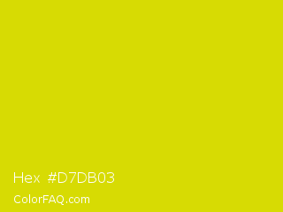 Hex #d7db03 Color is a normal yellow color and the nearest color is Peridot #e6e200. Hex code #d7db03 and RGB value is rgb(215,219,3). In RGB color space, this color is composed of 84% red, 86% green, 1% blue, In CMYK color space, this color is composed of 2% cyan, 0% magenta, 99% yellow , 14% black , In HSL color space, this color has a hue angle of 61° , 97% saturation and 44% lightness.