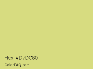 Hex #d7dc80 Color is a light yellow color and the nearest color is Medium Spring Bud #c9dc87. Hex code #d7dc80 and RGB value is rgb(215,220,128). In RGB color space, this color is composed of 84% red, 86% green, 50% blue, In CMYK color space, this color is composed of 2% cyan, 0% magenta, 42% yellow , 14% black , In HSL color space, this color has a hue angle of 63° , 57% saturation and 68% lightness.