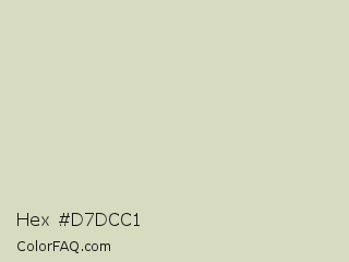 Hex #d7dcc1 Color is a very light lime color and the nearest color is Tana #d9dcc1. Hex code #d7dcc1 and RGB value is rgb(215,220,193). In RGB color space, this color is composed of 84% red, 86% green, 76% blue, In CMYK color space, this color is composed of 2% cyan, 0% magenta, 12% yellow , 14% black , In HSL color space, this color has a hue angle of 71° , 28% saturation and 81% lightness.