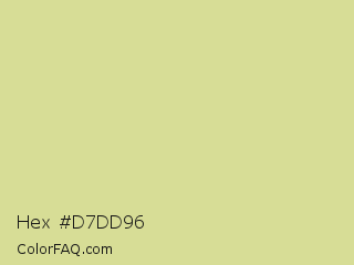 Hex #d7dd96 Color is a light yellow color and the nearest color is Deco #d2da97. Hex code #d7dd96 and RGB value is rgb(215,221,150). In RGB color space, this color is composed of 84% red, 87% green, 59% blue, In CMYK color space, this color is composed of 3% cyan, 0% magenta, 32% yellow , 13% black , In HSL color space, this color has a hue angle of 65° , 51% saturation and 73% lightness.
