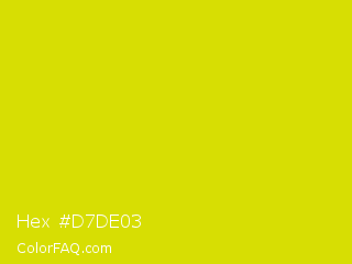 Hex #d7de03 Color is a normal yellow color and the nearest color is Peridot #e6e200. Hex code #d7de03 and RGB value is rgb(215,222,3). In RGB color space, this color is composed of 84% red, 87% green, 1% blue, In CMYK color space, this color is composed of 3% cyan, 0% magenta, 99% yellow , 13% black , In HSL color space, this color has a hue angle of 62° , 97% saturation and 44% lightness.