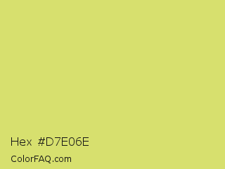 Hex #d7e06e Color is a light yellow color and the nearest color is Booger Buster #dde26a. Hex code #d7e06e and RGB value is rgb(215,224,110). In RGB color space, this color is composed of 84% red, 88% green, 43% blue, In CMYK color space, this color is composed of 4% cyan, 0% magenta, 51% yellow , 12% black , In HSL color space, this color has a hue angle of 65° , 65% saturation and 65% lightness.