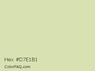 Hex #d7e1b1 Color is a light lime color and the nearest color is Caper #dcedb4. Hex code #d7e1b1 and RGB value is rgb(215,225,177). In RGB color space, this color is composed of 84% red, 88% green, 69% blue, In CMYK color space, this color is composed of 4% cyan, 0% magenta, 21% yellow , 12% black , In HSL color space, this color has a hue angle of 73° , 44% saturation and 79% lightness.