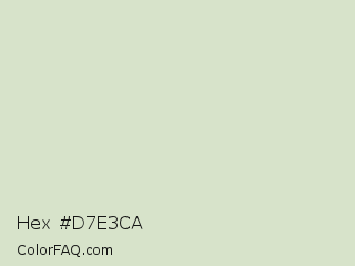 Hex #d7e3ca Color is a very light green color and the nearest color is Moon Mist #dcddcc. Hex code #d7e3ca and RGB value is rgb(215,227,202). In RGB color space, this color is composed of 84% red, 89% green, 79% blue, In CMYK color space, this color is composed of 5% cyan, 0% magenta, 11% yellow , 11% black , In HSL color space, this color has a hue angle of 89° , 31% saturation and 84% lightness.