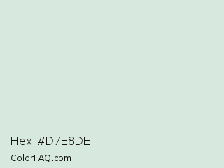 Hex #d7e8de Color is a very light green color and the nearest color is Zanah #daecd6. Hex code #d7e8de and RGB value is rgb(215,232,222). In RGB color space, this color is composed of 84% red, 91% green, 87% blue, In CMYK color space, this color is composed of 7% cyan, 0% magenta, 4% yellow , 9% black , In HSL color space, this color has a hue angle of 145° , 27% saturation and 88% lightness.