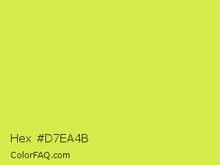 Hex #d7ea4b Color is a light yellow color and the nearest color is Maximum Green Yellow #d9e650. Hex code #d7ea4b and RGB value is rgb(215,234,75). In RGB color space, this color is composed of 84% red, 92% green, 29% blue, In CMYK color space, this color is composed of 8% cyan, 0% magenta, 68% yellow , 8% black , In HSL color space, this color has a hue angle of 67° , 79% saturation and 61% lightness.