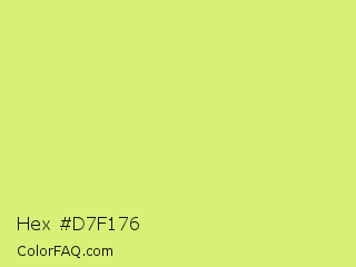 Hex #d7f176 Color is a light lime color and the nearest color is Booger Buster #dde26a. Hex code #d7f176 and RGB value is rgb(215,241,118). In RGB color space, this color is composed of 84% red, 95% green, 46% blue, In CMYK color space, this color is composed of 11% cyan, 0% magenta, 51% yellow , 5% black , In HSL color space, this color has a hue angle of 73° , 81% saturation and 70% lightness.