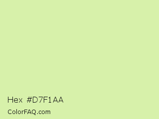 Hex #d7f1aa Color is a very light green color and the nearest color is Gossip #d2f8b0. Hex code #d7f1aa and RGB value is rgb(215,241,170). In RGB color space, this color is composed of 84% red, 95% green, 67% blue, In CMYK color space, this color is composed of 11% cyan, 0% magenta, 29% yellow , 5% black , In HSL color space, this color has a hue angle of 82° , 72% saturation and 81% lightness.
