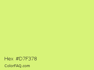 Hex #d7f378 Color is a light lime color and the nearest color is Mindaro #e3f988. Hex code #d7f378 and RGB value is rgb(215,243,120). In RGB color space, this color is composed of 84% red, 95% green, 47% blue, In CMYK color space, this color is composed of 12% cyan, 0% magenta, 51% yellow , 5% black , In HSL color space, this color has a hue angle of 74° , 84% saturation and 71% lightness.