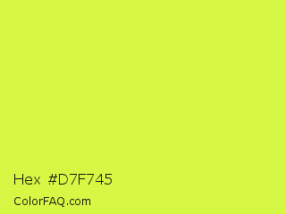 Hex #d7f745 Color is a light lime color and the nearest color is Maximum Green Yellow #d9e650. Hex code #d7f745 and RGB value is rgb(215,247,69). In RGB color space, this color is composed of 84% red, 97% green, 27% blue, In CMYK color space, this color is composed of 13% cyan, 0% magenta, 72% yellow , 3% black , In HSL color space, this color has a hue angle of 71° , 92% saturation and 62% lightness.