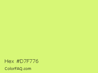 Hex #d7f776 Color is a light lime color and the nearest color is Mindaro #e3f988. Hex code #d7f776 and RGB value is rgb(215,247,118). In RGB color space, this color is composed of 84% red, 97% green, 46% blue, In CMYK color space, this color is composed of 13% cyan, 0% magenta, 52% yellow , 3% black , In HSL color space, this color has a hue angle of 75° , 89% saturation and 72% lightness.