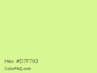 Hex #d7f793 Color is a light lime color and the nearest color is Mindaro #e3f988. Hex code #d7f793 and RGB value is rgb(215,247,147). In RGB color space, this color is composed of 84% red, 97% green, 58% blue, In CMYK color space, this color is composed of 13% cyan, 0% magenta, 40% yellow , 3% black , In HSL color space, this color has a hue angle of 79° , 86% saturation and 77% lightness.