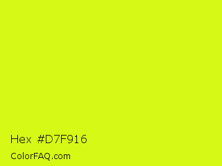 Hex #d7f916 Color is a normal yellow color and the nearest color is Arctic Lime #d0ff14. Hex code #d7f916 and RGB value is rgb(215,249,22). In RGB color space, this color is composed of 84% red, 98% green, 9% blue, In CMYK color space, this color is composed of 14% cyan, 0% magenta, 91% yellow , 2% black , In HSL color space, this color has a hue angle of 69° , 95% saturation and 53% lightness.